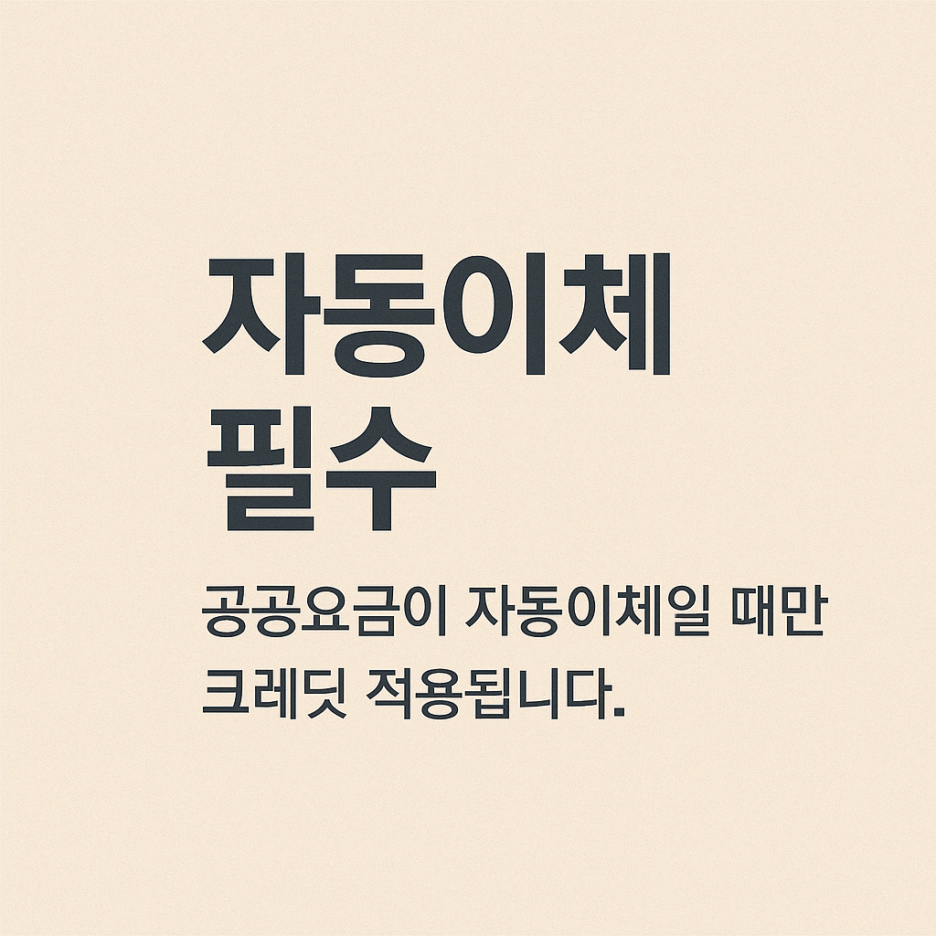 사용 조건: 위 항목들은 반드시 자동이체 등록이 되어 있어야 하며, 일반 수동 납부는 인정되지 않습니다. 고지서에 등록된 자동이체 계좌 기준으로 크레딧이 자동 차감됩니다.