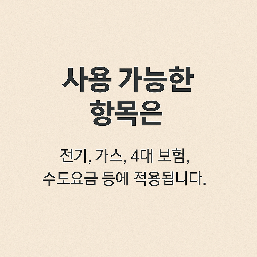 - 적용 가능한 항목: 전기, 가스, 4대 보험, 일부 수도요금