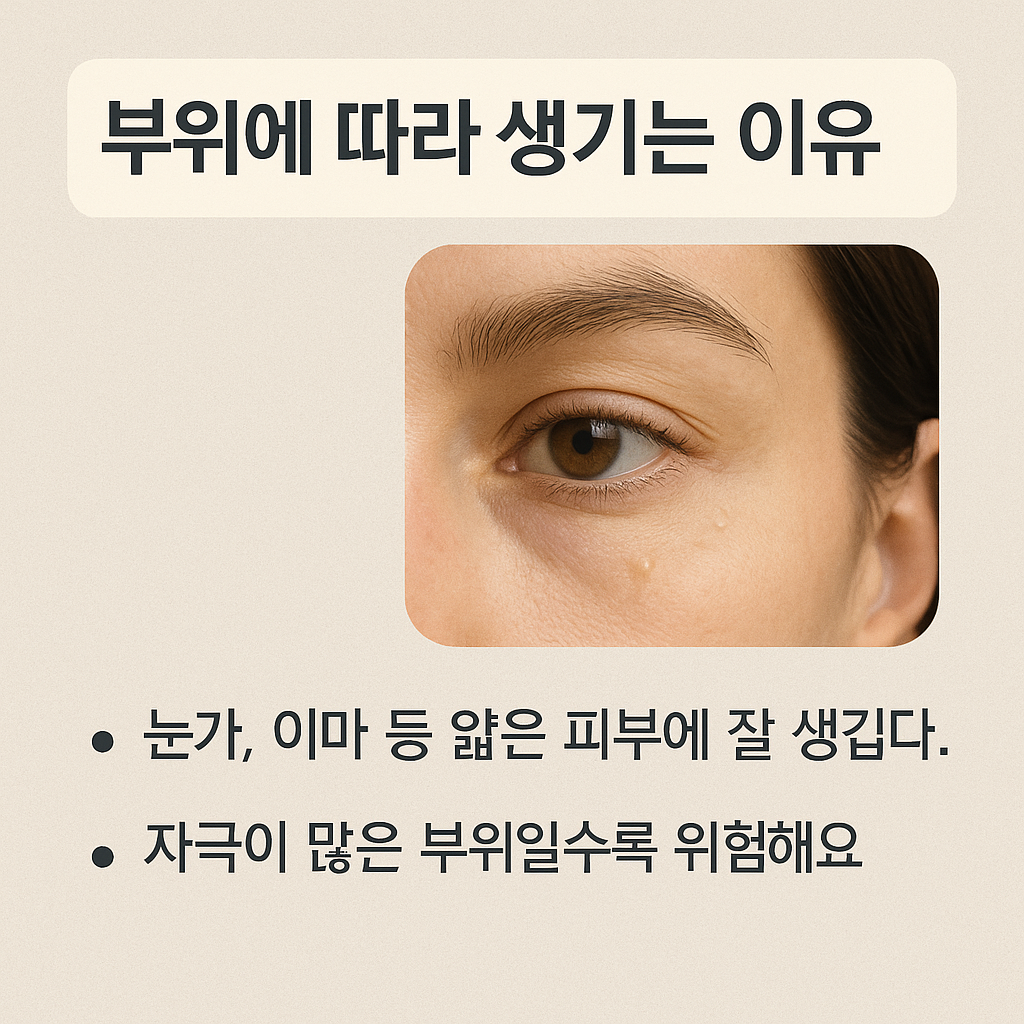 - 눈가 및 눈꺼풀: 피지선이 적고 자극이 많아 비립종 발생률 가장 높음