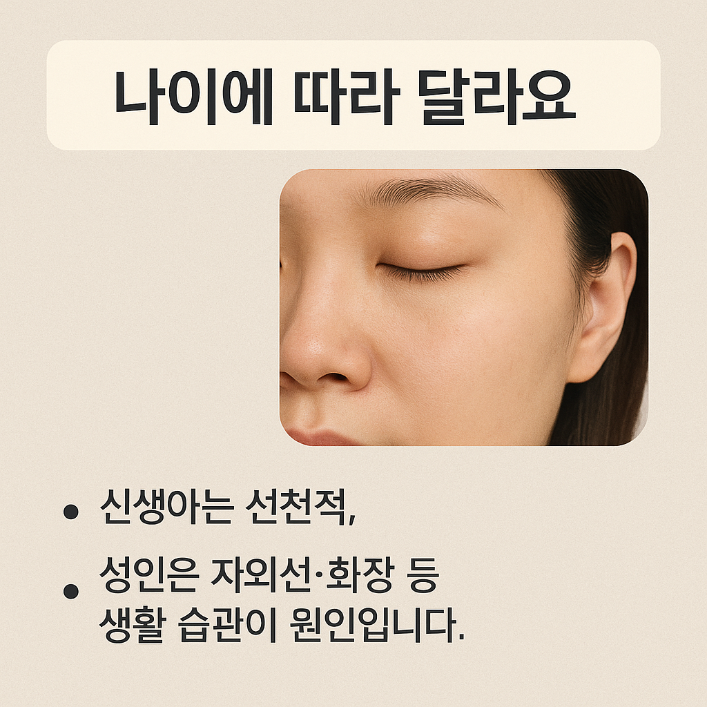 | 유전적·선천적 요인 | 신생아에게 흔히 발생하며 시간이 지나면 자연 소실됨 |