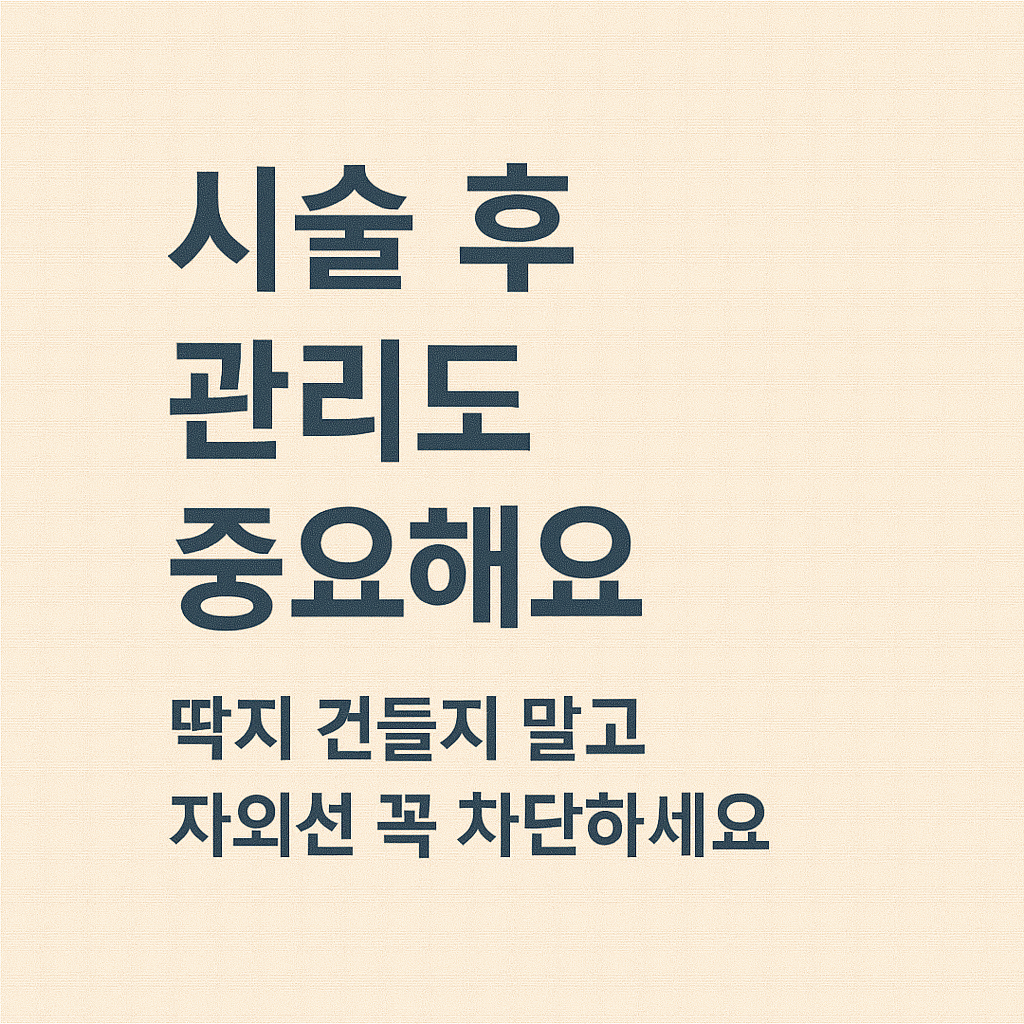 - 자외선 차단: 외출 전 반드시 SPF30 이상 자외선 차단제를 발라야 하며, 회복기에는 모자나 선글라스 등 물리적 차단도 도움이 됩니다.