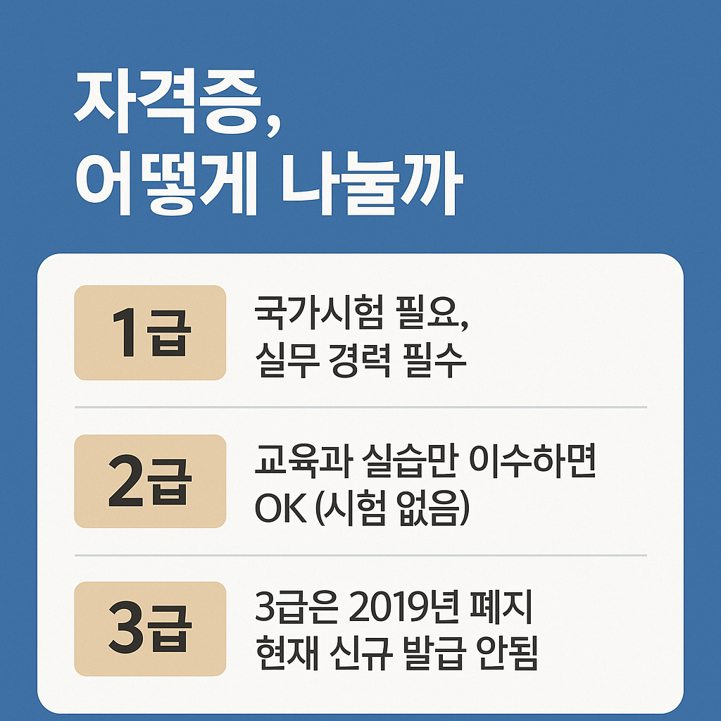 자격은 아래와 같이 3단계로 나뉘지만, 3급은 2019년 4월 25일부로 폐지되었기 때문에 현재는 1급과 2급이 중심입니다: