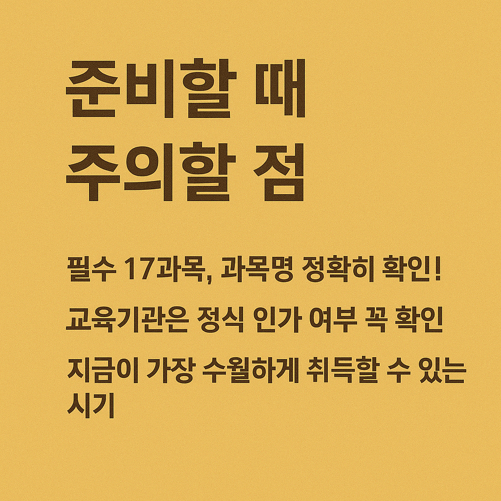 - 학점은행제 기관: 교육부 인가 평생교육원 등에서 운영. 유연하고 빠르게 수료 가능
