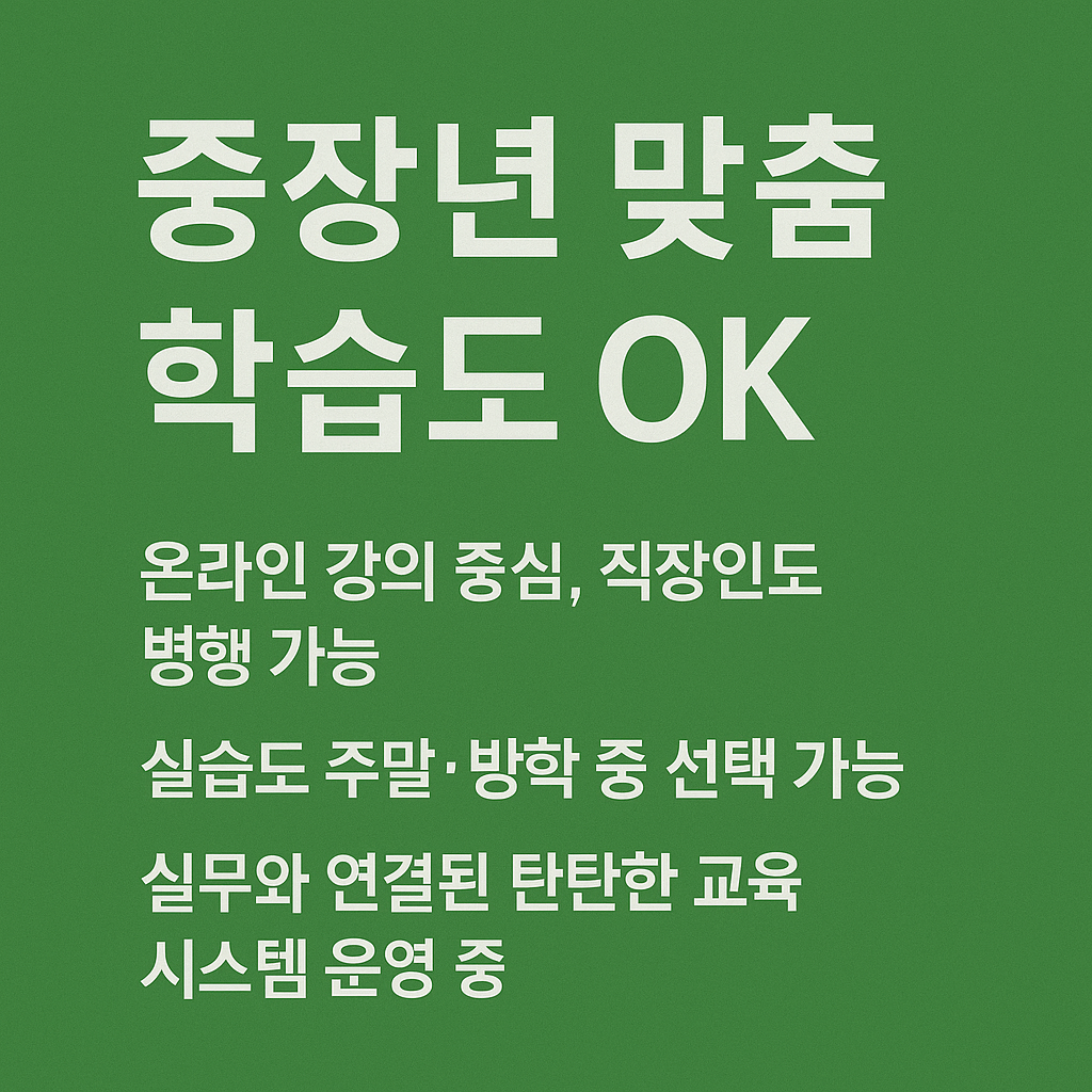 이처럼 제도가 강화되면서, 오히려 중장년층에게는 더 유리한 환경이 조성되고 있습니다. 많은 교육기관에서는 40~60대 수강생을 위한 맞춤 커리큘럼을 운영하고 있으며, 다음과 같은 편의성을 제공합니다: