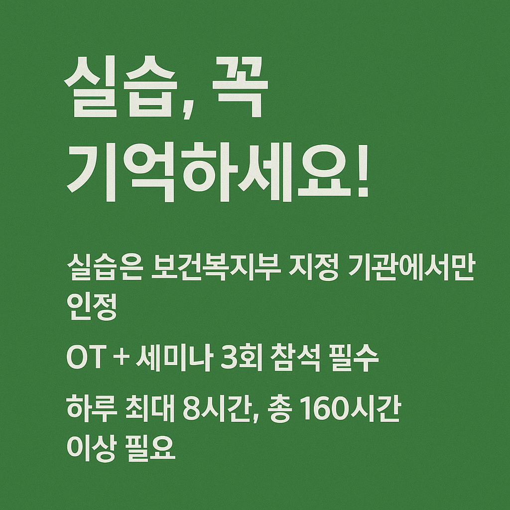 2025년부터 실습기관에 대한 조건도 까다롭게 바뀌었습니다. 실습기관은 반드시 보건복지부가 인증한 기관이어야 하며, 실습기관장이 아래 요건을 충족해야 합니다: