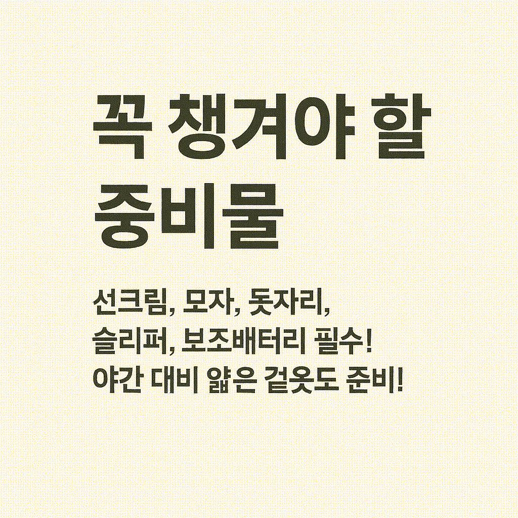 | 햇빛 대비 | 선크림, 모자, 선글라스 | 강한 자외선 차단을 위해 반드시 필요 |
