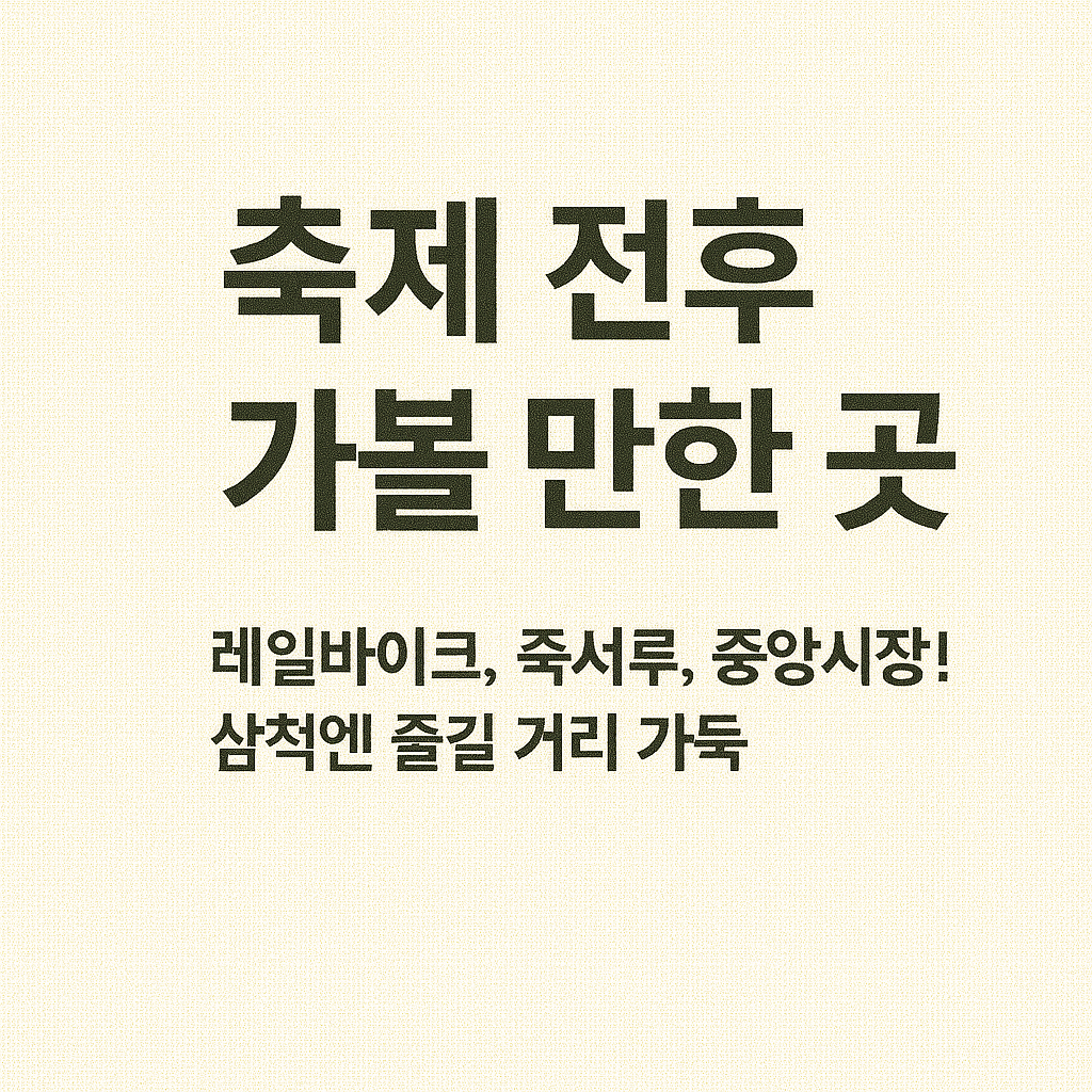 축제 하루 전 또는 후에 하루 더 머물며 여유롭게 삼척의 자연, 전통, 체험을 즐겨보세요. 삼척은 단순한 여름 축제 장소를 넘어 사계절 내내 매력 있는 여행지입니다.