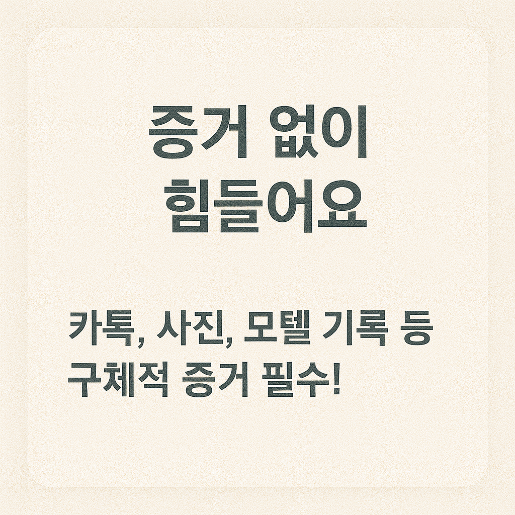 문자, SNS 메시지, 사진, 녹취 등은 날짜, 위치, 인물 등이 명확해야 하며, 조작되지 않았음을 입증할 수 있어야 합니다. - 숙박업소 영수증, CCTV 등도 가능