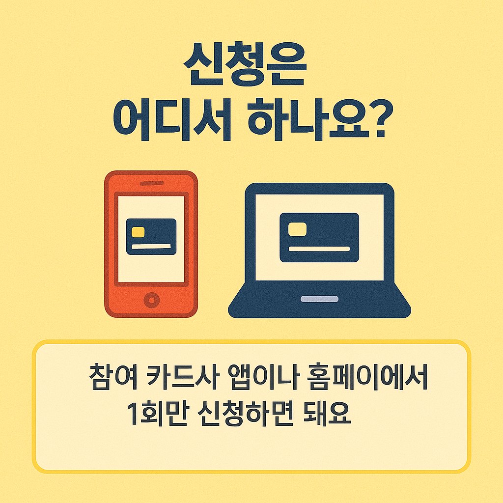 - 참여 카드사는 국민카드, 신한카드, 삼성카드, 현대카드, 롯데카드, 우리 카드 등 주요 8대 카드사이며, 각 사의 공식 채널에서 신청 가능 여부를 확인할 수 있습니다.