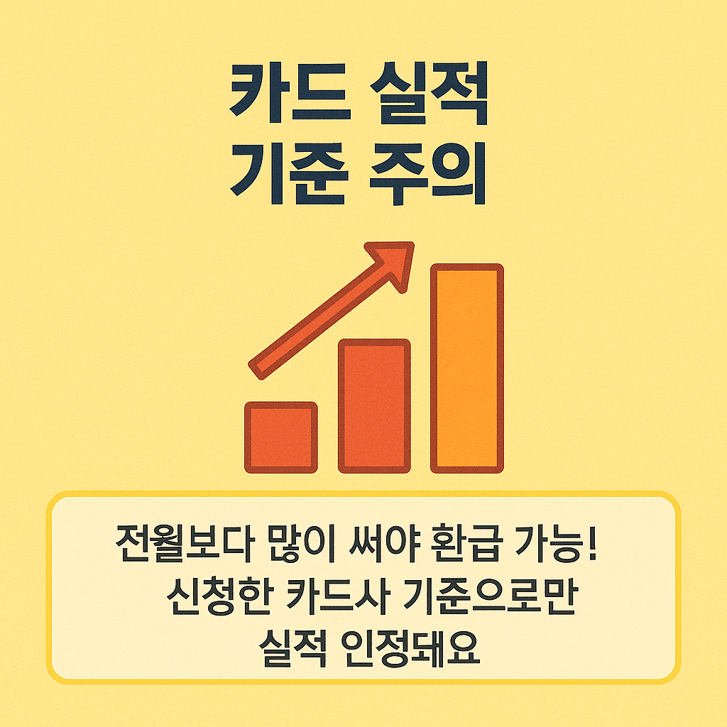 - 기준 실적은 참여 전월(예: 2025년 8월 기준, 7월 카드 실적)을 기준으로 하며, 해당 월의 카드 사용액이 기준 실적을 초과할 경우, 초과분의 10%를 환급받는 방식입니다.