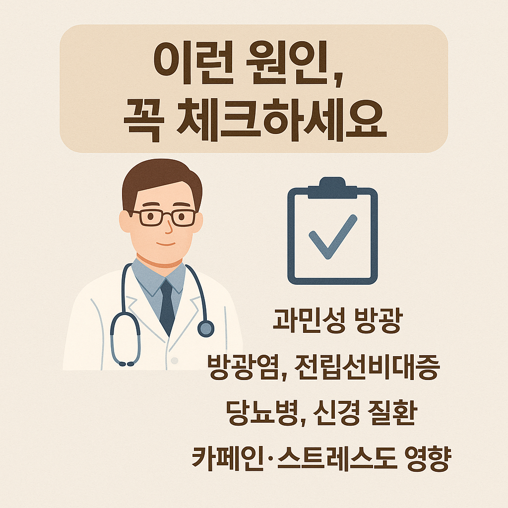 2025년 기준, 아래의 질환들은 빈뇨 증상과 밀접하게 관련되어 있으며, 다음과 같은 특징적인 동반 증상이 있을 경우 반드시 의심해야 합니다.