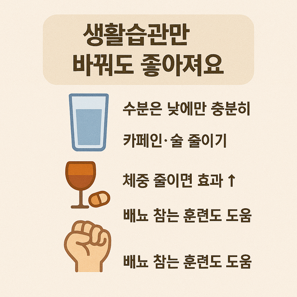 소변이 자주 마려운 증상은 약물이나 수술보다 앞서 생활습관 개선만으로도 충분히 호전되는 경우가 많습니다. 특히 과민성 방광이나 경증의 빈뇨는 일상에서의 행동 변화가 가장 기본적인 치료법이 됩니다.