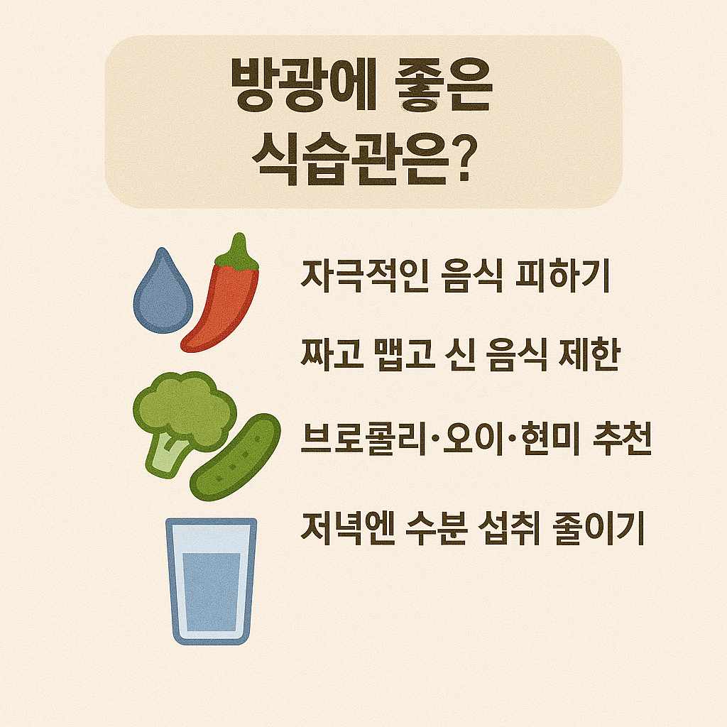 또한, 수분 배출을 돕는 이뇨 작용 음식(예: 셀러리, 파인애플 등)은 빈뇨가 심할 경우 일시적으로 섭취를 줄이는 것이 좋습니다.