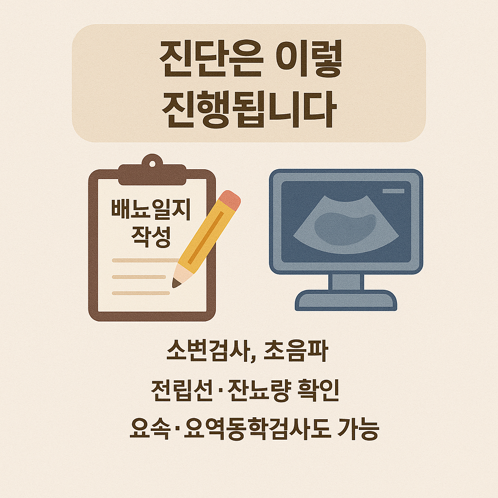 | 요역동학 검사 | 방광 압력·수축력·요도 저항 등 정밀 측정 | 원인 불분명하거나 수술 고려자 |