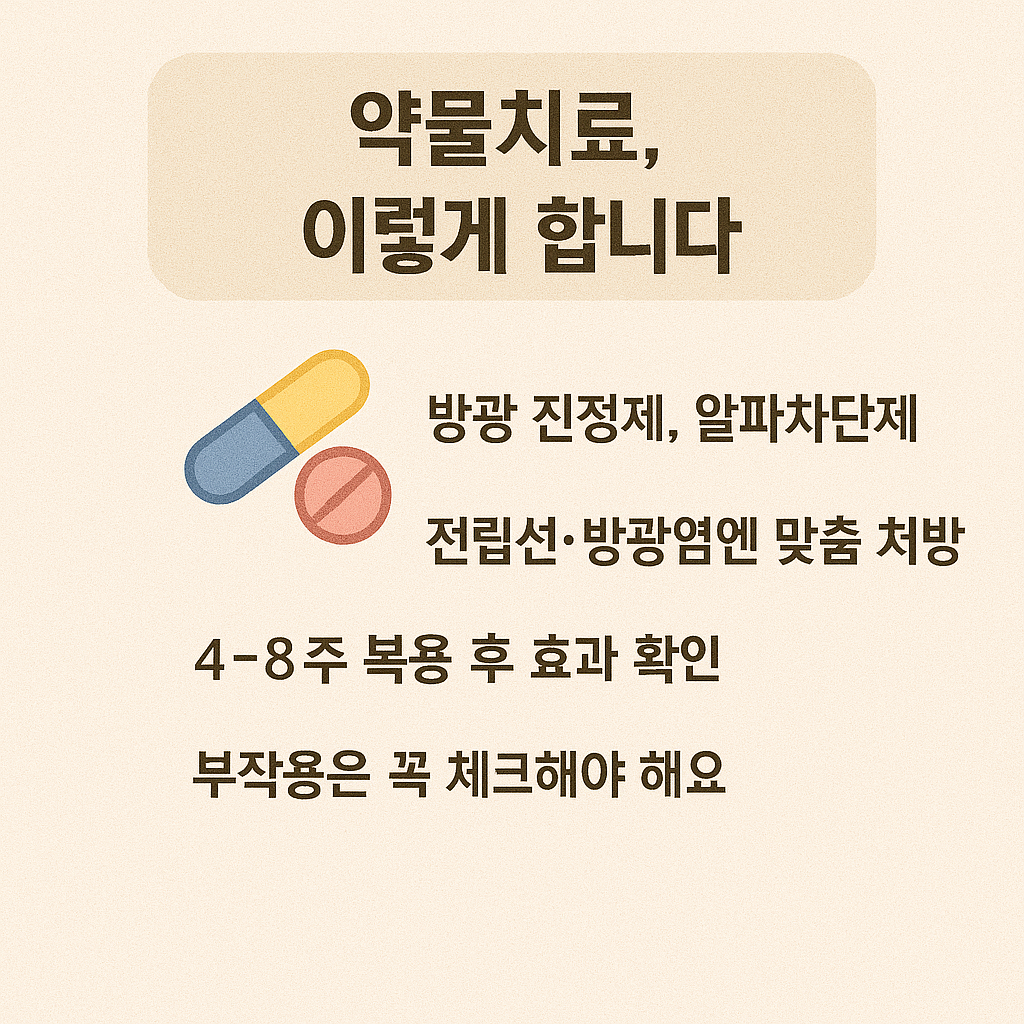 소변이 자주 마려운 증상이 생활습관 개선만으로 해결되지 않거나, 기저 질환이 동반된 경우에는 약물치료 또는 병원 시술이 필요합니다. 2025년 현재 다양한 약물과 비수술 치료가 가능하며, 대부분 외래 진료로 진행됩니다.