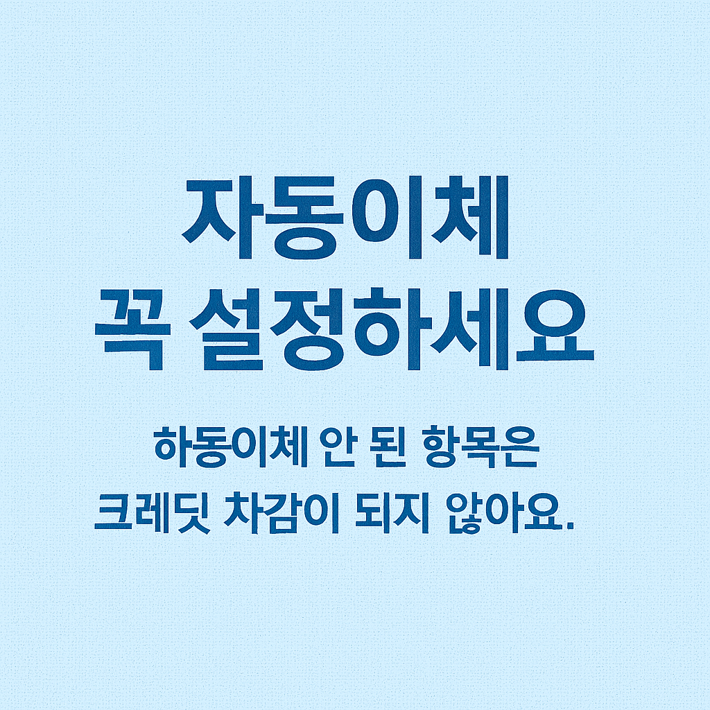 특히 유의할 점은 자동이체 여부입니다. 동일한 카드로 요금을 납부해도 자동이체 설정이 되어 있지 않으면 차감이 되지 않으며, 이 경우 크레딧이 계속해서 남아 있게 됩니다. 따라서 반드시 사전에 각 항목에 대해 자동이체가 설정되어 있는지 확인이 필요합니다.