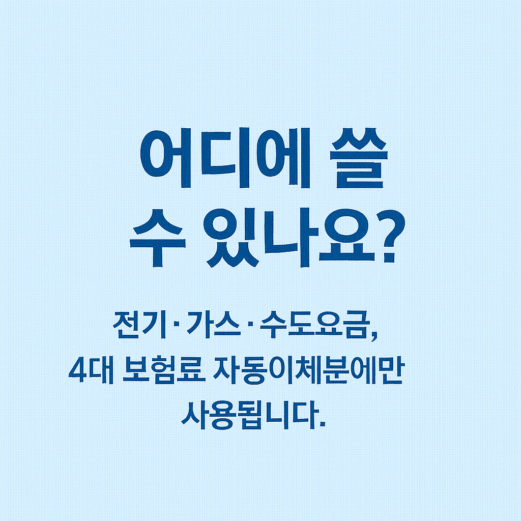 공공요금 외 사용은 원천 차단되어 있으며, 크레딧은 일반 포인트처럼 가맹점 결제나 온라인 쇼핑 등에 사용할 수 없습니다. 제도 목적이 ‘고정 공공비용 부담 완화’이므로, 이 외 지출은 지원되지 않습니다.