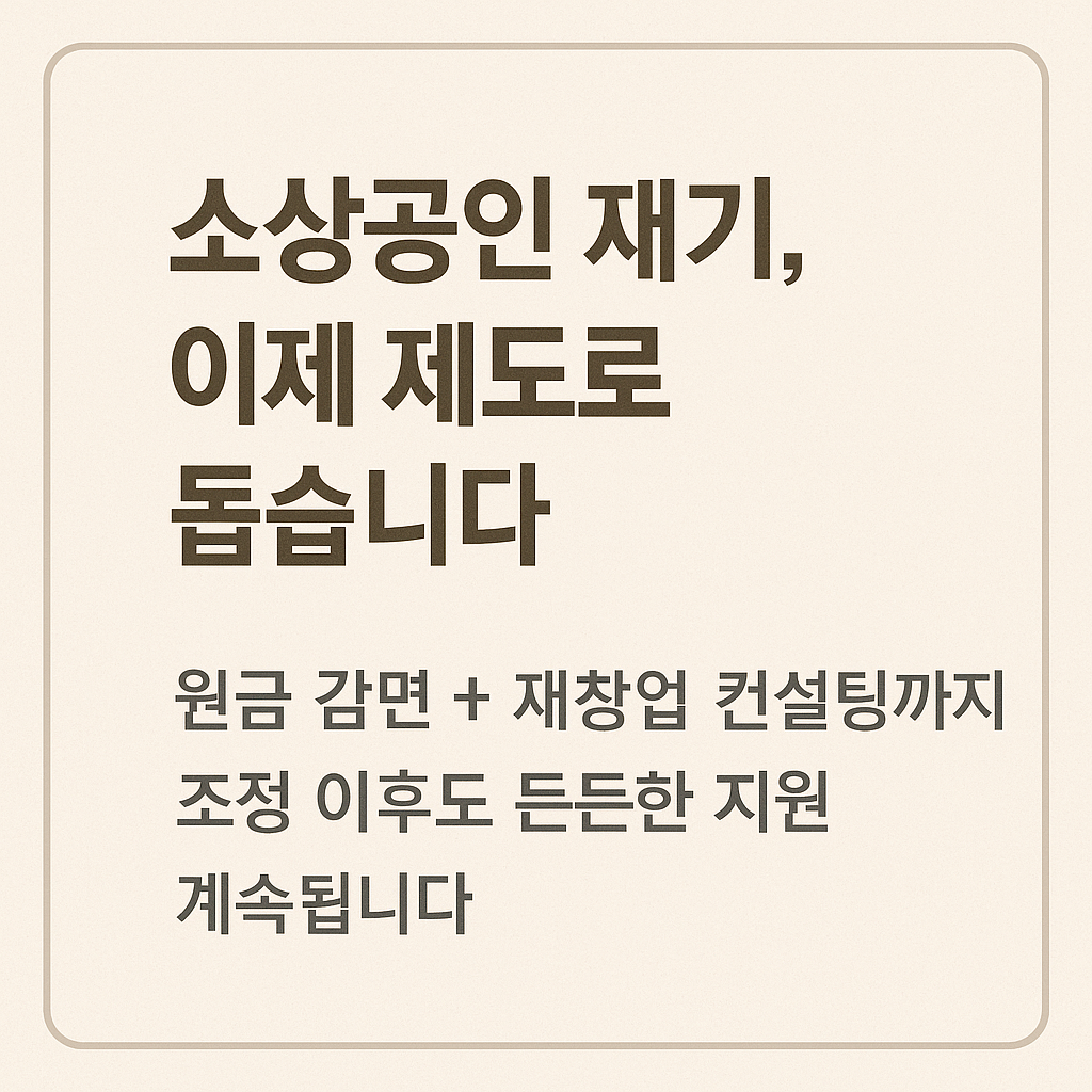 채무조정은 단순히 빚을 줄여주는 것이 아닙니다. 그것은 새로운 기회의 시작이며, 소상공인이 다시 고객 앞에 설 수 있도록 돕는 희망의 제도입니다. 제도의 문을 두드리세요. 그 안에는 다시 일어설 수 있는 구체적인 방법이 있습니다.