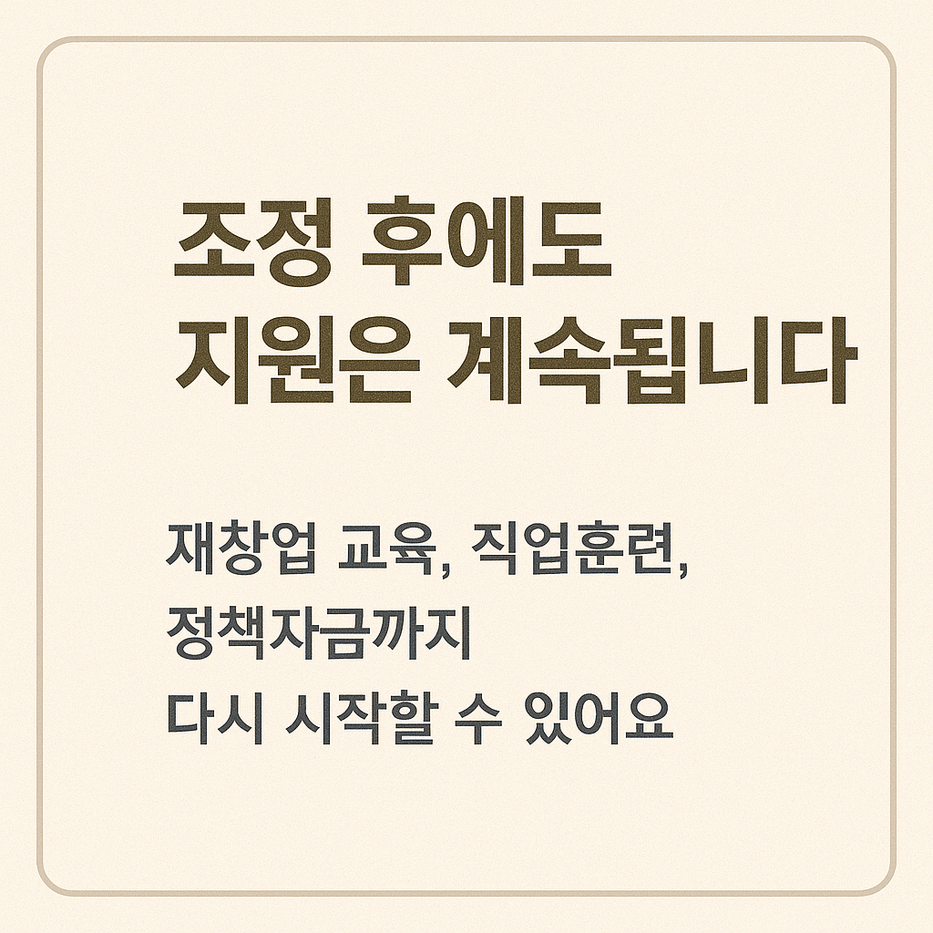채무조정은 끝이 아니라 시작입니다. 정부는 채무조정 이후에도 재창업·재취업 등 경제적 재기를 위한 다층적 후속 지원 제도를 함께 운영하고 있습니다. 이러한 제도를 적극 활용하면 단순한 빚 감면을 넘어 장기적인 회복 기반을 마련할 수 있습니다.