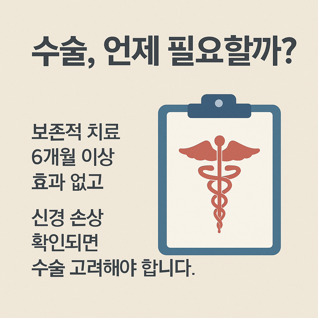 - 수술 필요 여부 판단: 보존적 치료 6개월 이상 효과 없거나 기능 저하 시