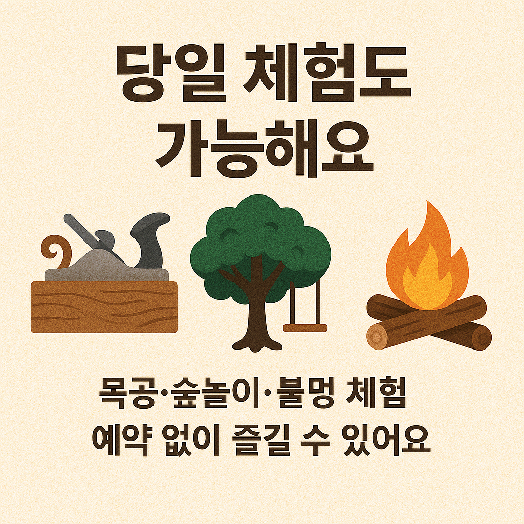 - 체험 내용: 목공 체험, 자연 놀이 활동, 숲명상, LP 감상, 불멍 체험 등