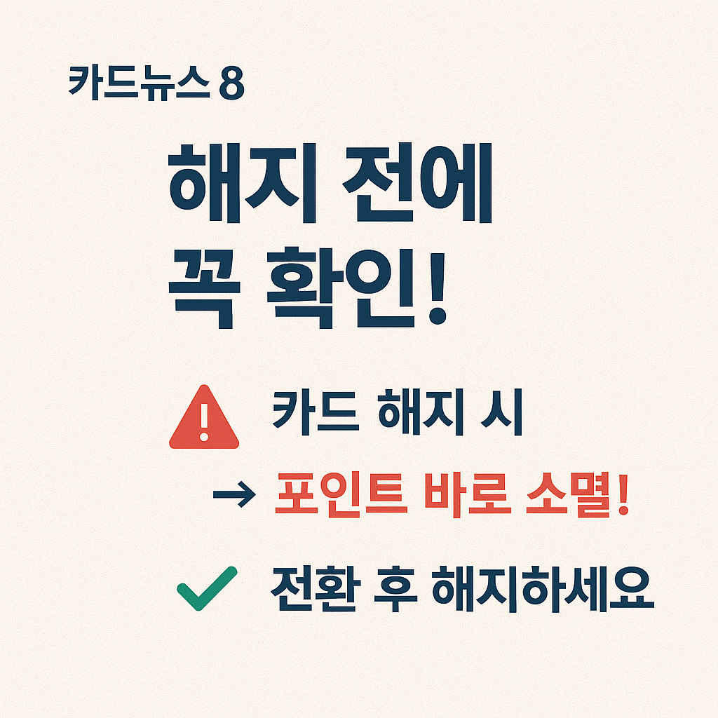 - 카드 해지 전 포인트 전환 필수: 카드를 해지하면 남아 있는 포인트는 대부분 즉시 소멸됩니다. 해지 전 반드시 포인트 현금전환 또는 사용을 완료해야 합니다.