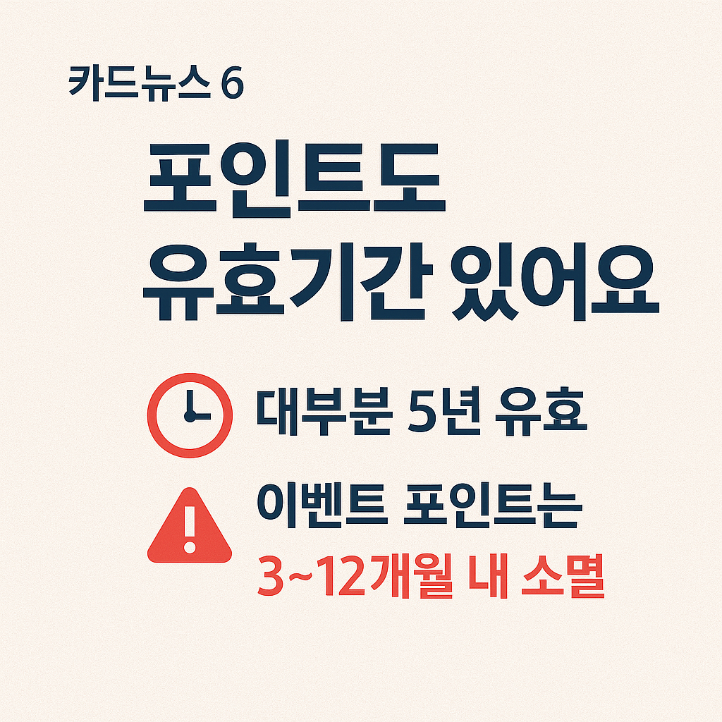 또한 포인트 유효기간도 매우 중요한 항목입니다. 보통 카드사 자체 포인트는 적립일로부터 5년간 유효하지만, 이벤트 포인트나 한정 지급 포인트는 적게는 3개월에서 12개월 내 자동 소멸됩니다.