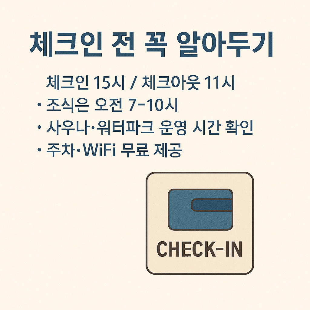 쏠비치 남해 리조트를 더욱 편리하고 알차게 이용하기 위해서는 기본 운영 정보 및 부대시설 사용 조건을 사전에 파악하는 것이 중요합니다. 체크인·체크아웃 시간은 물론, 워터파크·사우나·조식 운영 시간 등도 미리 알아두면 현장에서 혼선을 줄일 수 있습니다.