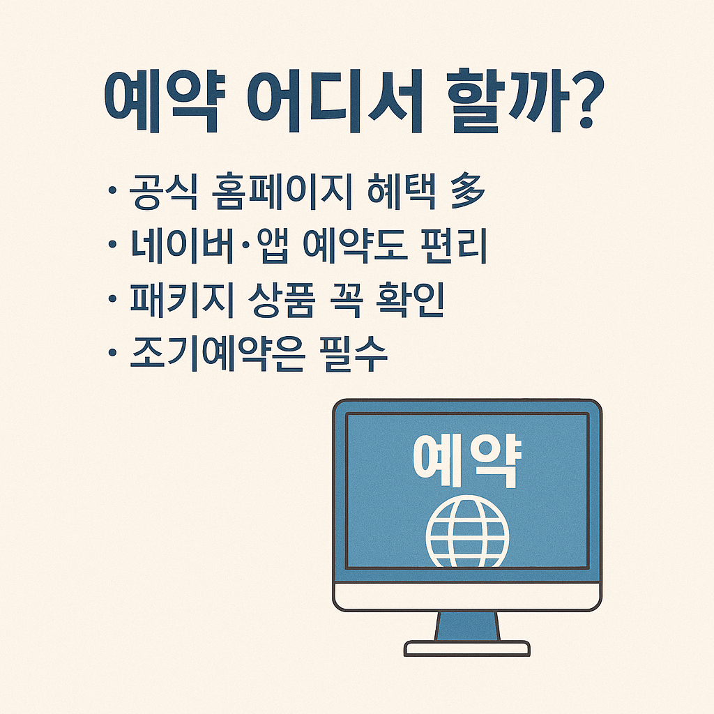 가장 안정적인 예약은 공식 홈페이지를 통해 이루어지며, 회원가입 시 연중 할인, 포인트 적립, 얼리버드 특가 등의 혜택이 주어집니다.