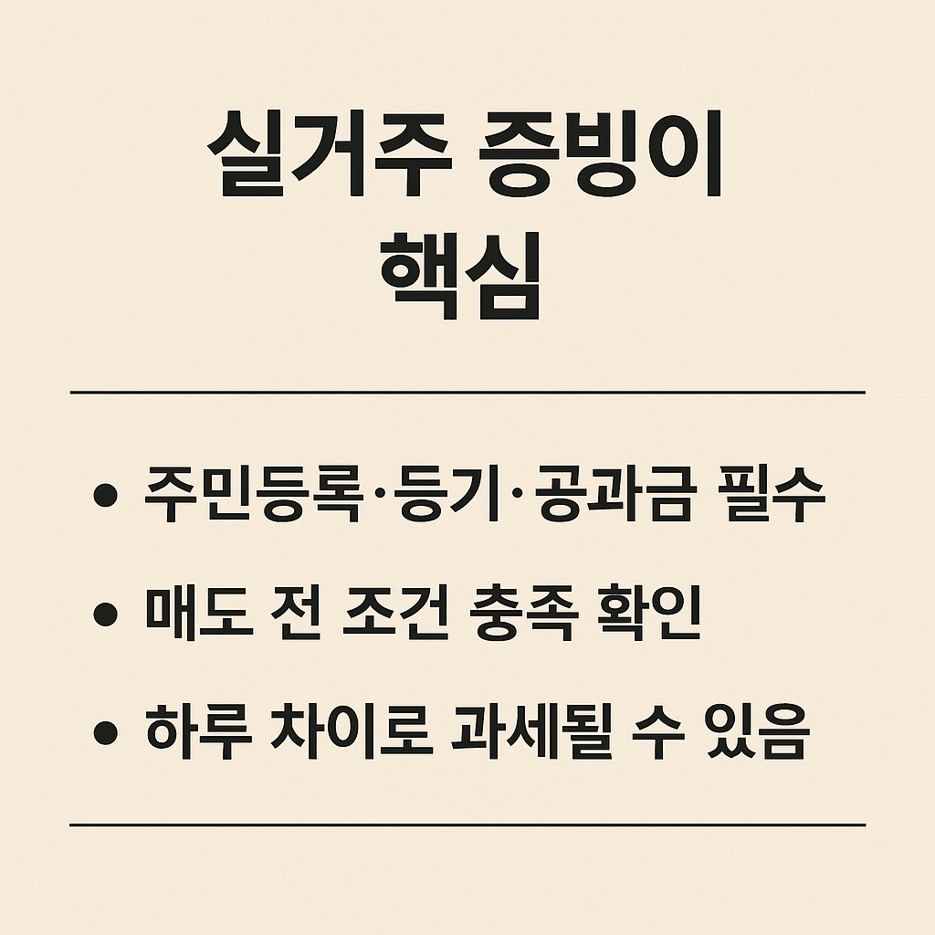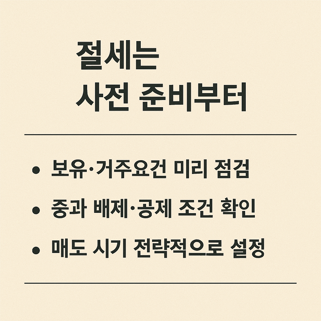 - 절세 전략은 양도일 기준으로 요건 충족 여부에 따라 달라짐 → 거주, 등록, 보유 기록 정비 필수