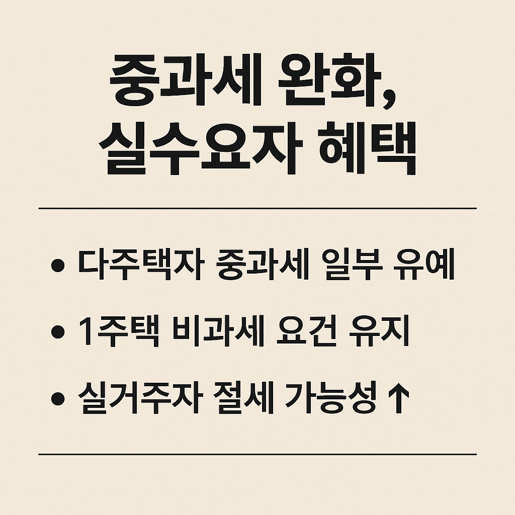 - 조정대상지역 다주택자 중과세율 완화로 매물 유도와 시장 정상화 기대
