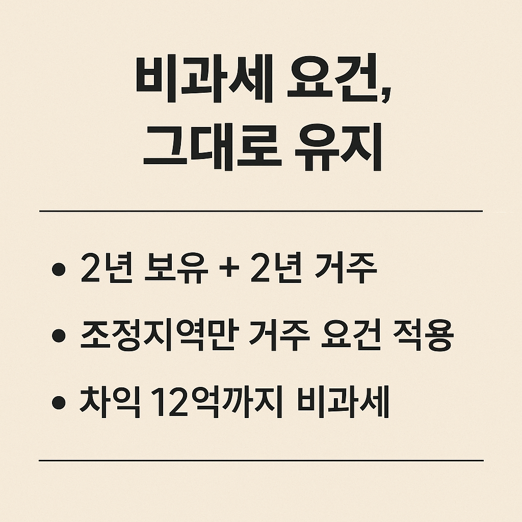 | 1세대 1주택 비과세 | 거주기간 연장, 2024년 거주 기록 확보 | 2024년까지 |