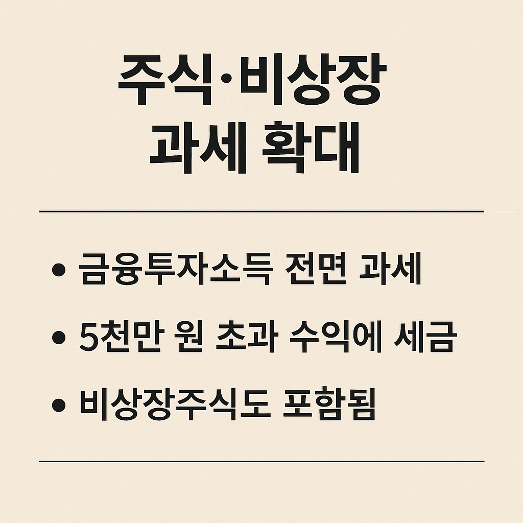 | 비상장주식 | 일부 고액 양도자 대상 | 과세 범위 확대, 일반 투자자 포함 |