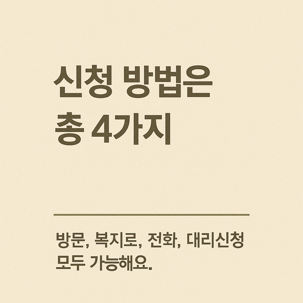 방문 시에는 담당 복지 공무원이 자격 요건 확인 및 시스템 입력을 도와주므로, 서류가 준비되어 있다면 가장 안정적인 방법입니다.