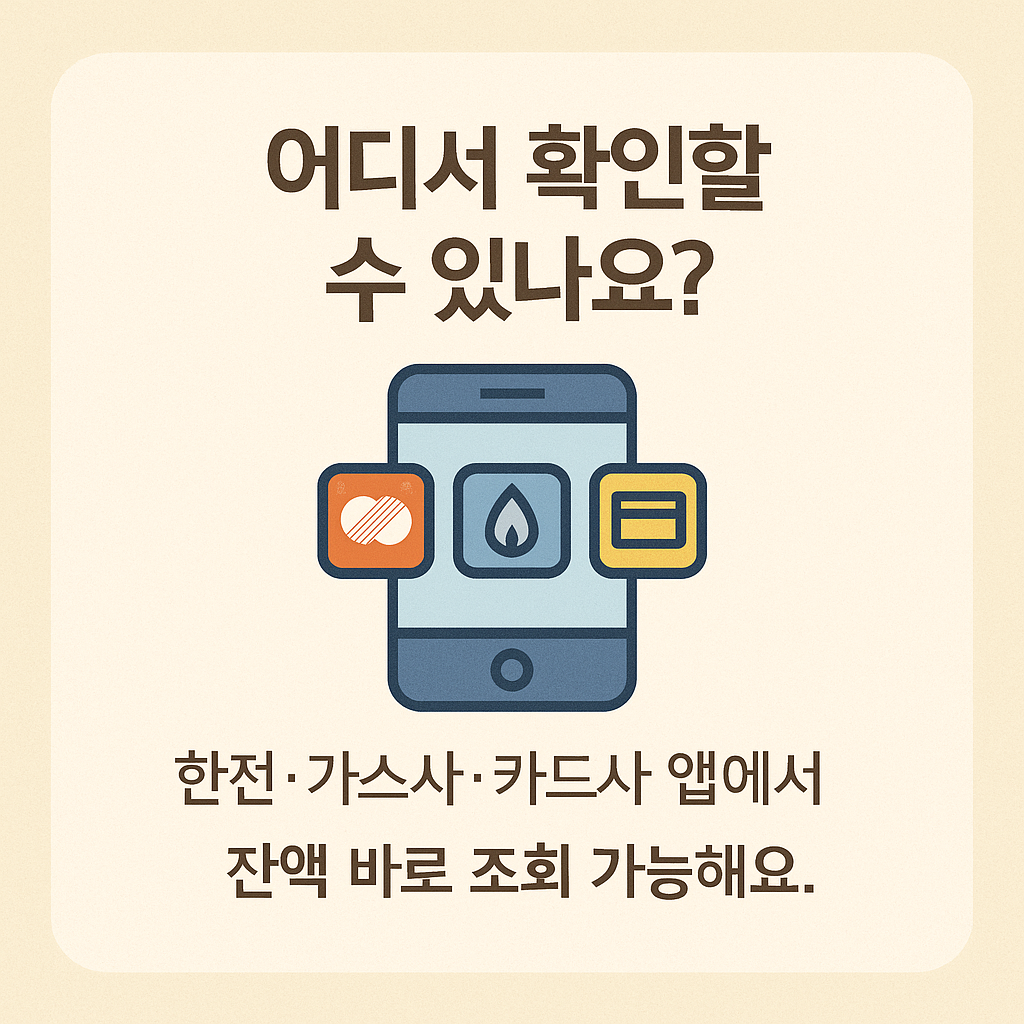 - 한전 사이버지점, 도시가스사 앱, 카드사 앱에서 직접 잔액 조회