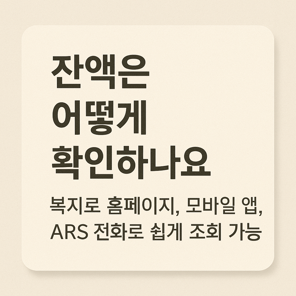 - 모바일 앱: 복지로 모바일 앱 또는 관련 복지 앱에서 잔액 및 사용 내역을 조회할 수 있음
