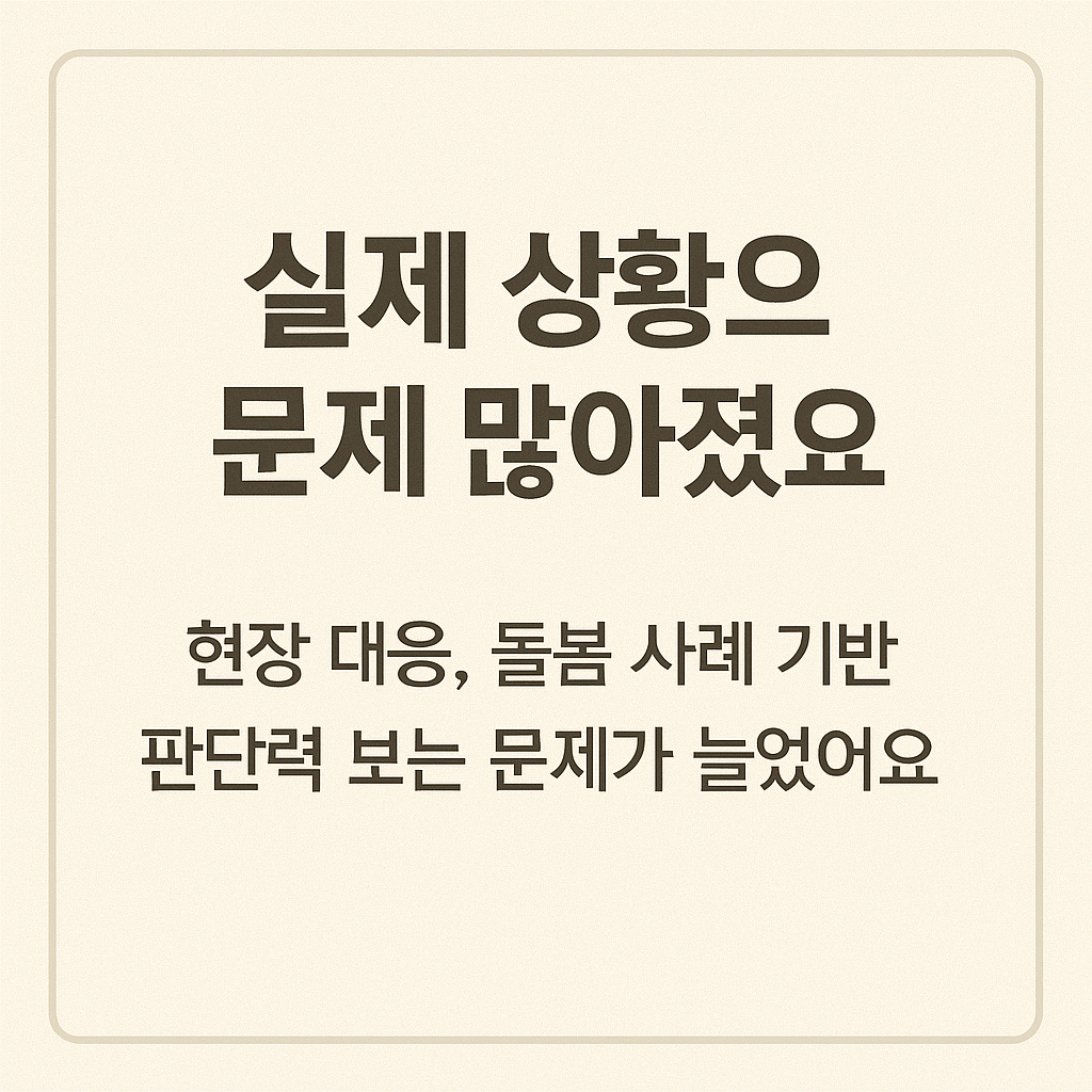 최근 출제 경향의 가장 큰 특징은 실무 현장에서 흔히 발생하는 돌봄 사례를 기반으로 한 문항 비중의 증가입니다. 수험생이 실제 상황에서 적절한 판단을 내릴 수 있는지를 평가하는 방식으로, 다음과 같은 문제 유형이 자주 출제됩니다: