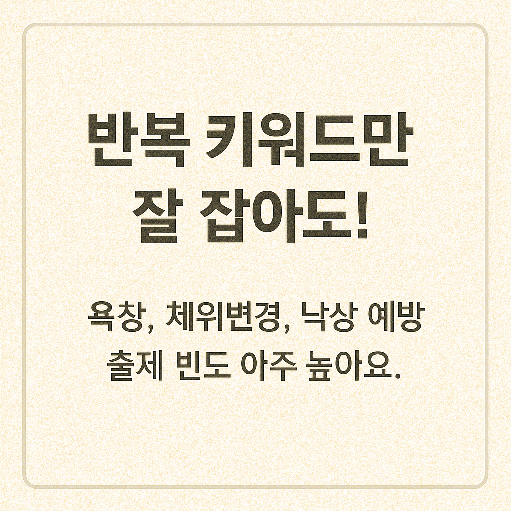 요양보호사 기출문제를 분석하면, 해마다 출제 유형이 조금씩 달라지긴 하지만, 반복적으로 등장하는 핵심 키워드들이 있습니다. 이 키워드를 체계적으로 정리해두면 암기 부담을 줄이고, 실전에서 문제를 빠르게 파악하는 데 큰 도움이 됩니다. 이 단원에서는 영역별로 자주 출제되는 키워드를 분류하고, 실전에서 어떻게 활용되는지도 함께 설명합니다.