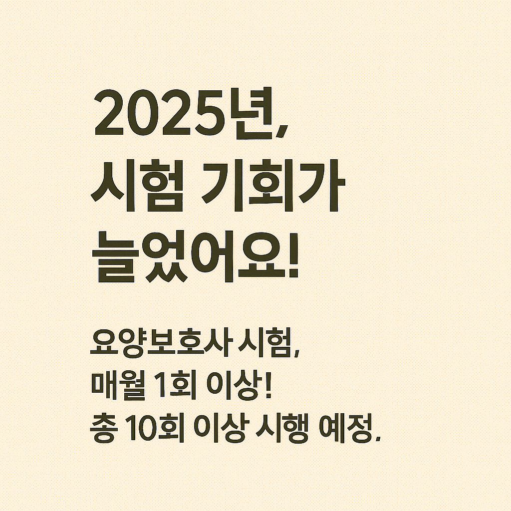 2025년 요양보호사 시험일정은 기존 연 4회 시행되던 방식에서 대폭 확대되어, 연 10회 이상 시행될 예정입니다. 한국보건의료인국가시험원(국시원)은 2024년부터 이 제도를 예고했고, 수요 확대와 자격증 제도 개편에 따라 실제로 매월 1회 이상 정기 시험이 운영되고 있습니다.
