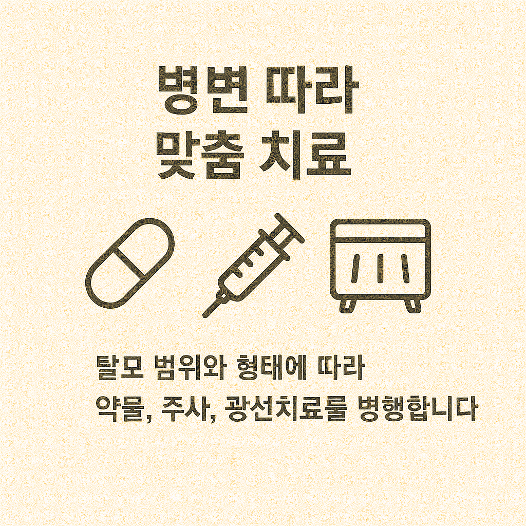 | 전두형/전신형 | JAK 억제제 + 광선/PRP 병행 계획 | 반응율 최대화 및 재발 억제 |