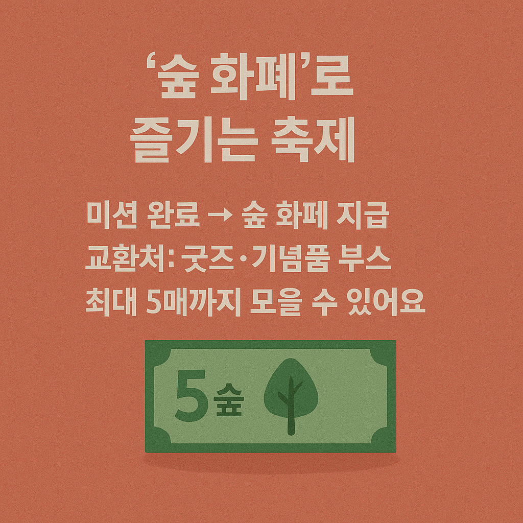 ‘숲 화폐’는 축제 현장에서 사용 가능한 가상의 체험 쿠폰으로, 체험부스나 기념품 교환소 등에서 실제 화폐처럼 활용됩니다. 방문객은 간단한 미션을 수행하거나 이벤트에 참여하면 숲 화폐를 얻을 수 있고, 이를 다양한 방식으로 사용할 수 있습니다.