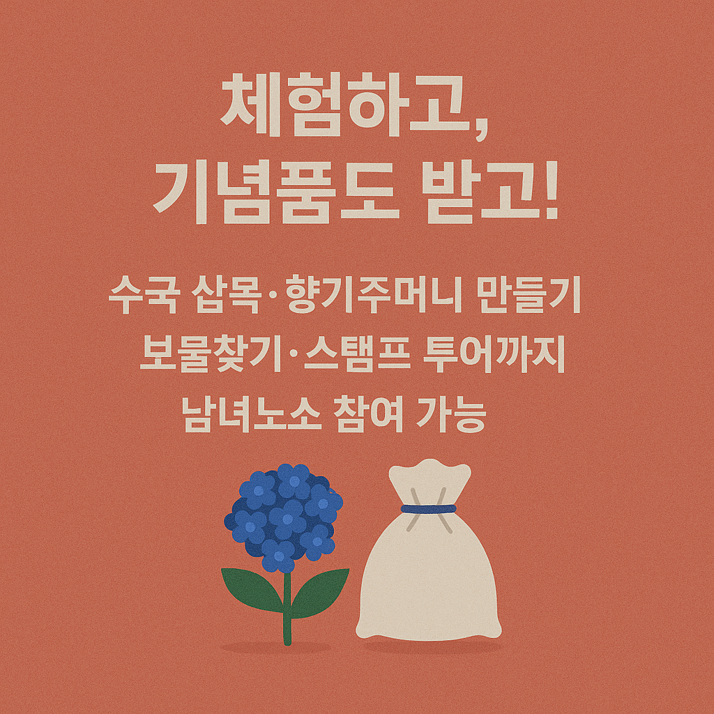 축제장 내 4개 구간(입구, 수국터널, 쉼터, 이벤트존)을 모두 방문해 스탬프를 찍으면 숲 화폐 1매 또는 특별 스티커를 받을 수 있습니다. 스탬프 투어는 어린이뿐만 아니라 연인·가족 단위 관람객에게 큰 호응을 얻고 있으며, 자연 속 탐방과 놀이를 동시에 즐길 수 있는 방식으로 인기를 끌고 있습니다.