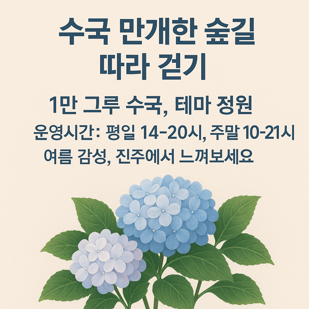월아산 숲속의 진주 수국꽃축제 2025는 경남 진주시 월아산 숲속에서 펼쳐지는 여름 대표 꽃 축제입니다. 1만여 그루의 수국이 빛나는 숲길 속에서 가족·연인·사진 애호가 모두 즐길 수 있는 체험 프로그램, 포토존, 편의시설이 제공됩니다.