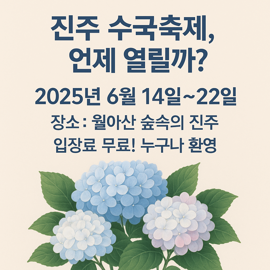 월아산 숲속의 진주 수국꽃축제 2025는 경상남도 진주시에서 매년 개최되는 대표 여름 꽃 축제입니다. 특히 수국이 절정에 이르는 6월 중순, 진주시민과 관광객들에게 계절의 정취와 힐링의 시간을 선사하는 축제로 자리매김하고 있습니다. 2025년 행사는 작년과 마찬가지로 6월 중순부터 9일간 운영될 예정이며, 정확한 일정과 장소는 아래와 같이 안내됩니다.