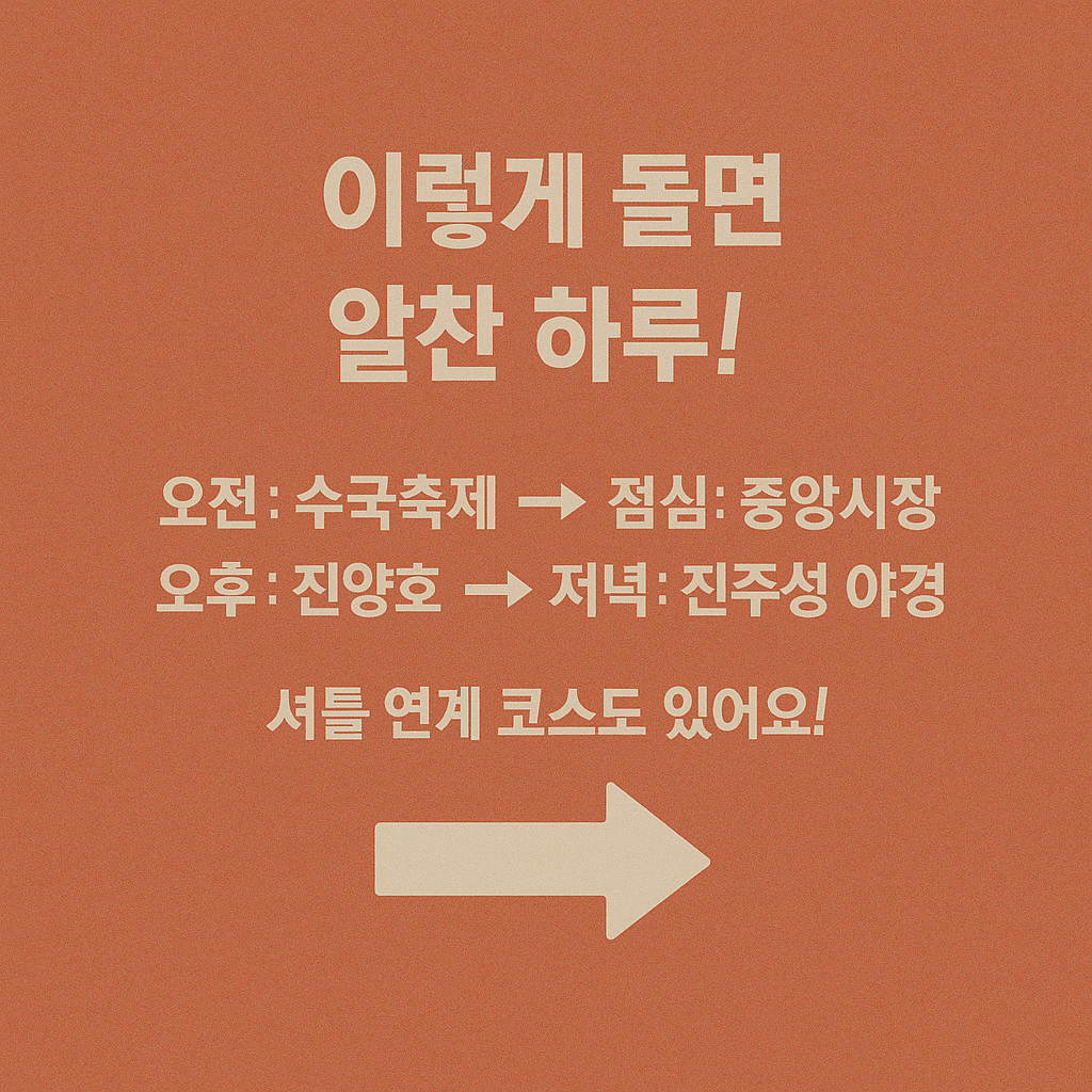 이 코스는 하루 일정 기준으로 구성되었으며, 중간중간 카페 방문이나 추가 체험 프로그램을 넣으면 개인 스타일에 맞춰 조정 가능합니다. 또한 축제 기간에는 진주시 전역에서 다양한 소규모 문화 공연, 플리마켓, 지역 특산물 판매도 함께 진행되므로 SNS나 진주시청 공지사항을 참고하면 유익합니다.