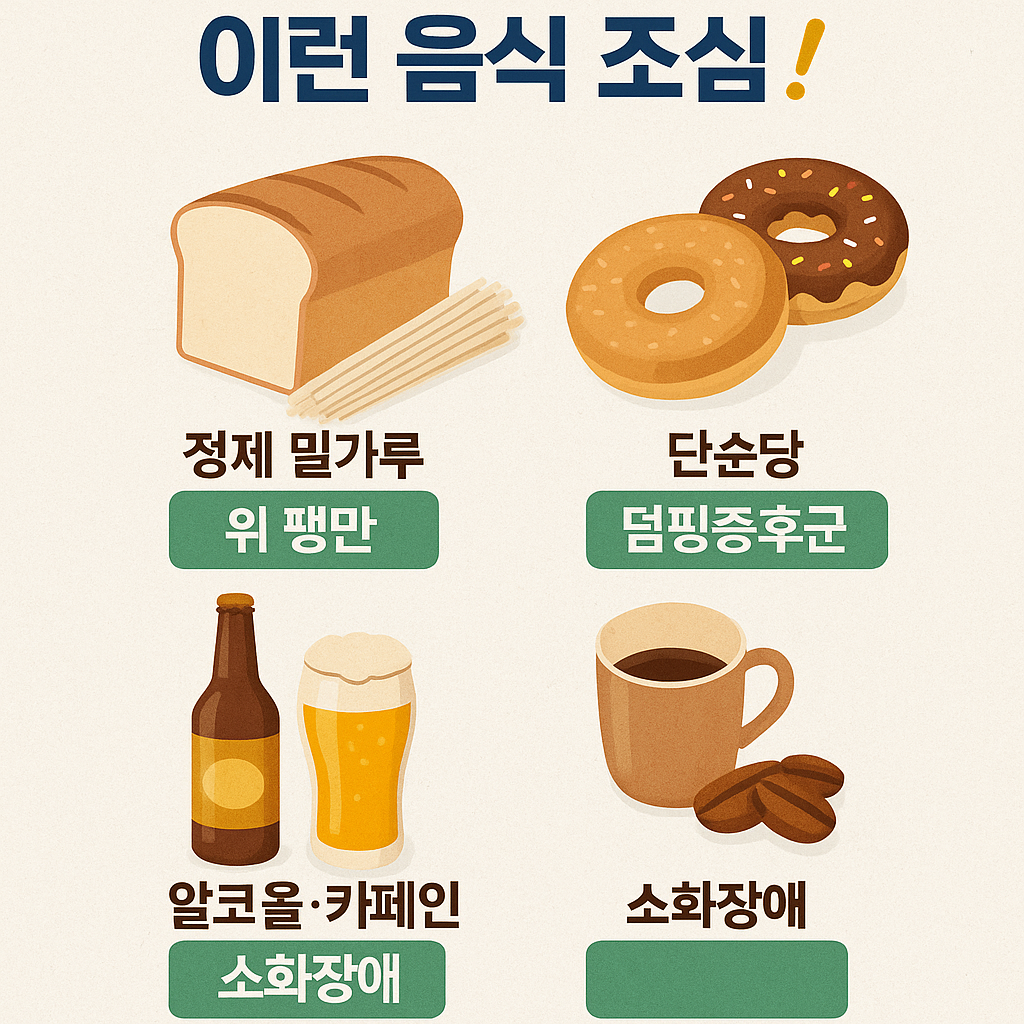 | 정제 밀가루 음식 | 소화 지연 및 혈당 급등 → 덤핑증후군 발생 위험 |