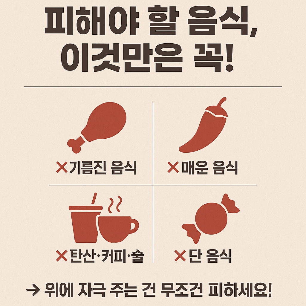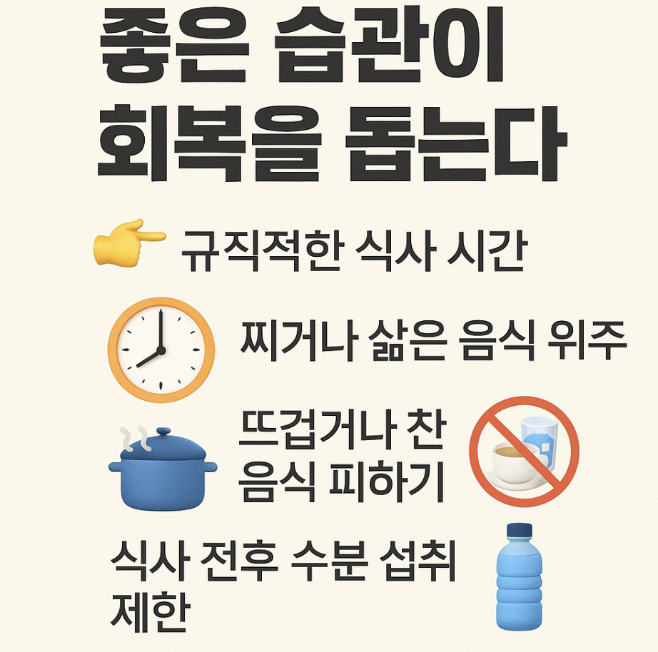 - 절대 피할 음식: 자극적인 음식, 가공육, 탄산음료, 과도한 지방·당분
