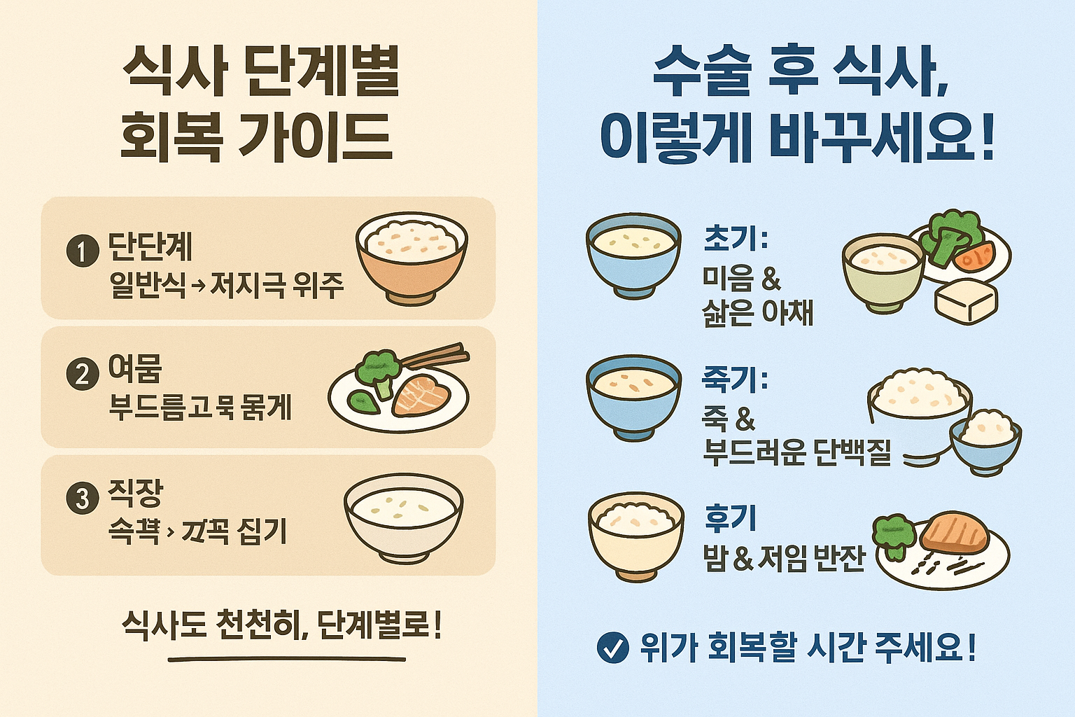 위암수술후좋은음식은 수술 후 회복과 영양 보충을 돕고, 위 기능을 보존하며 부작용을 최소화하는 데 큰 역할을 합니다. 단백질, 비타민, 무기질 등을 골고루 섭취하면서도 소화에 부담이 없고 자극적이지 않아야 합니다. 수술 시기에 따라 식단은 단계적으로 조절해야 하며, 아래에 추천 식품과 구체적 식단 예시를 정리했습니다.