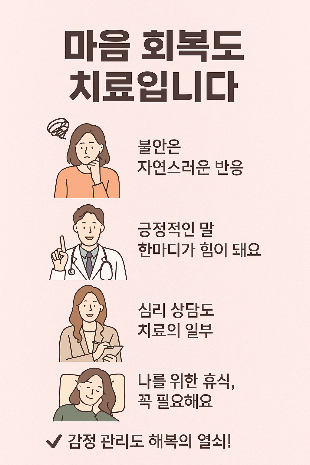 심리적 안정은 위암 수술 후 회복의 핵심입니다. 마음이 안정되어야 식사도, 운동도, 재활도 제대로 이뤄질 수 있습니다. 환자 스스로의 내면을 돌보는 것이 진정한 치료의 시작임을 기억해야 합니다.