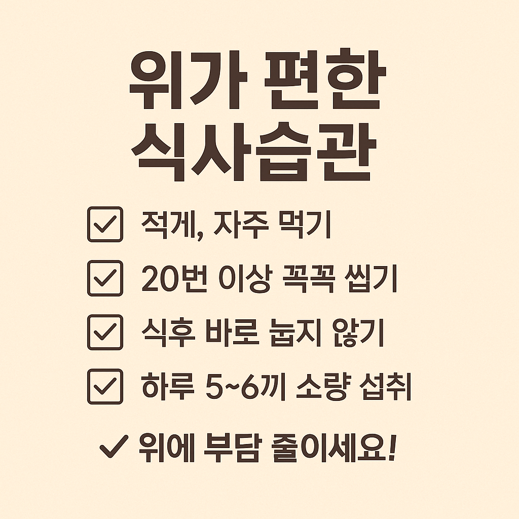- 천천히, 적게, 자주 먹기: 하루 5~6끼 소량 분할 식사
